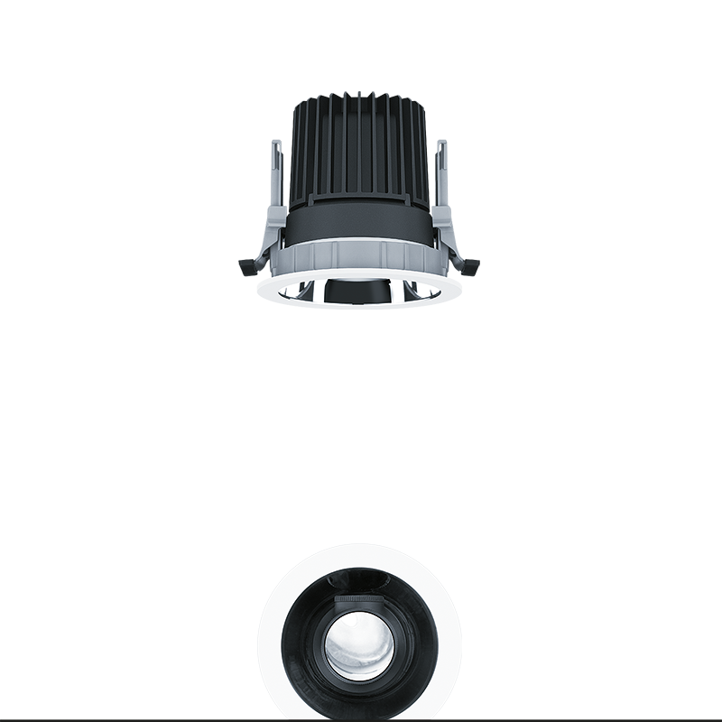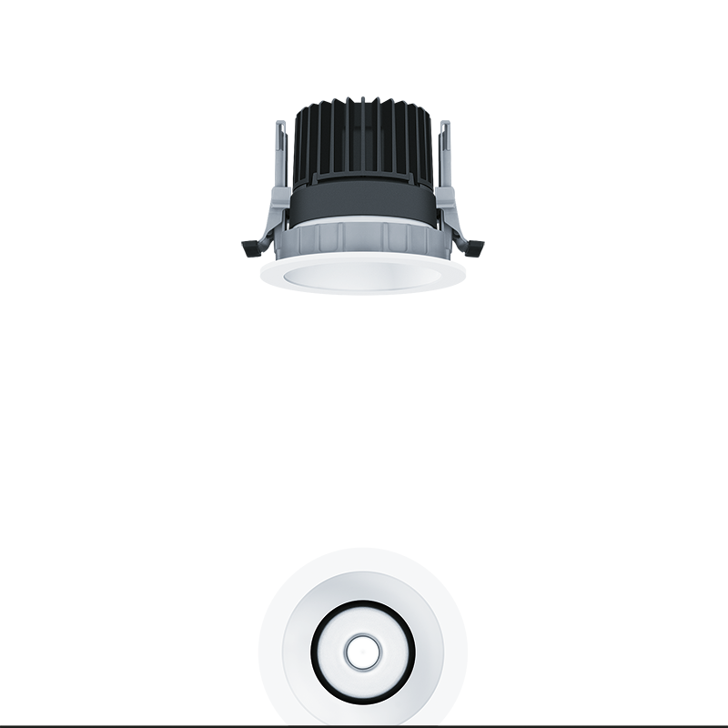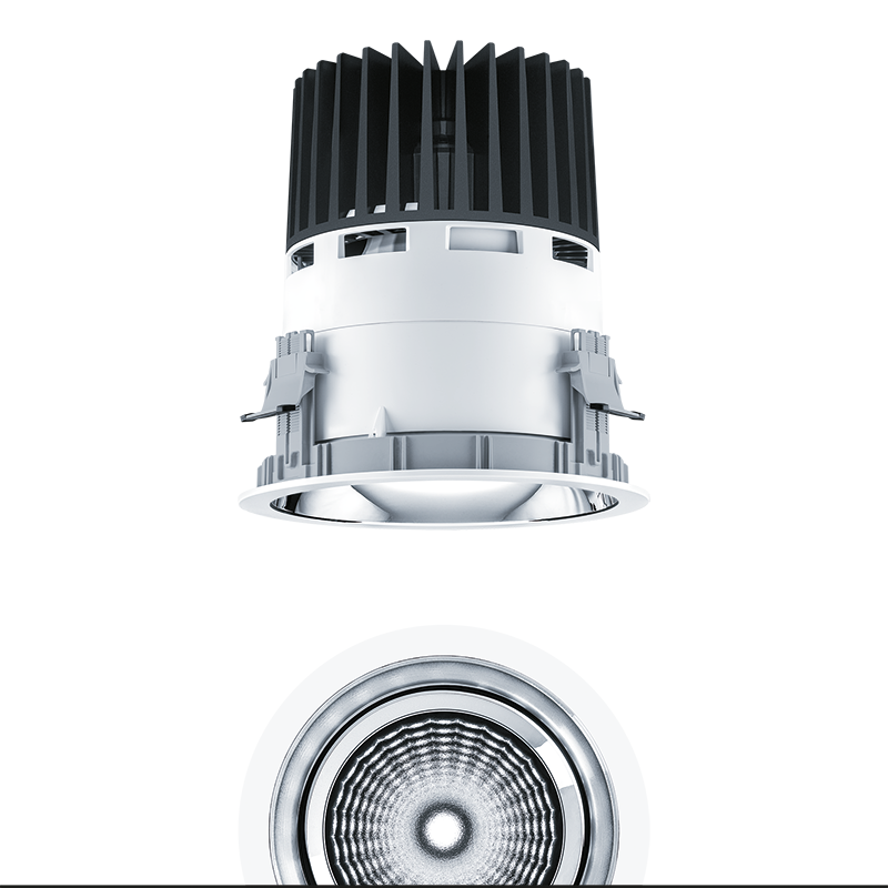 PANOS downlight Q140 avec faisceau de distribution large et symétrique, rendement maximal luminaire et meilleure qualité de lumière ;